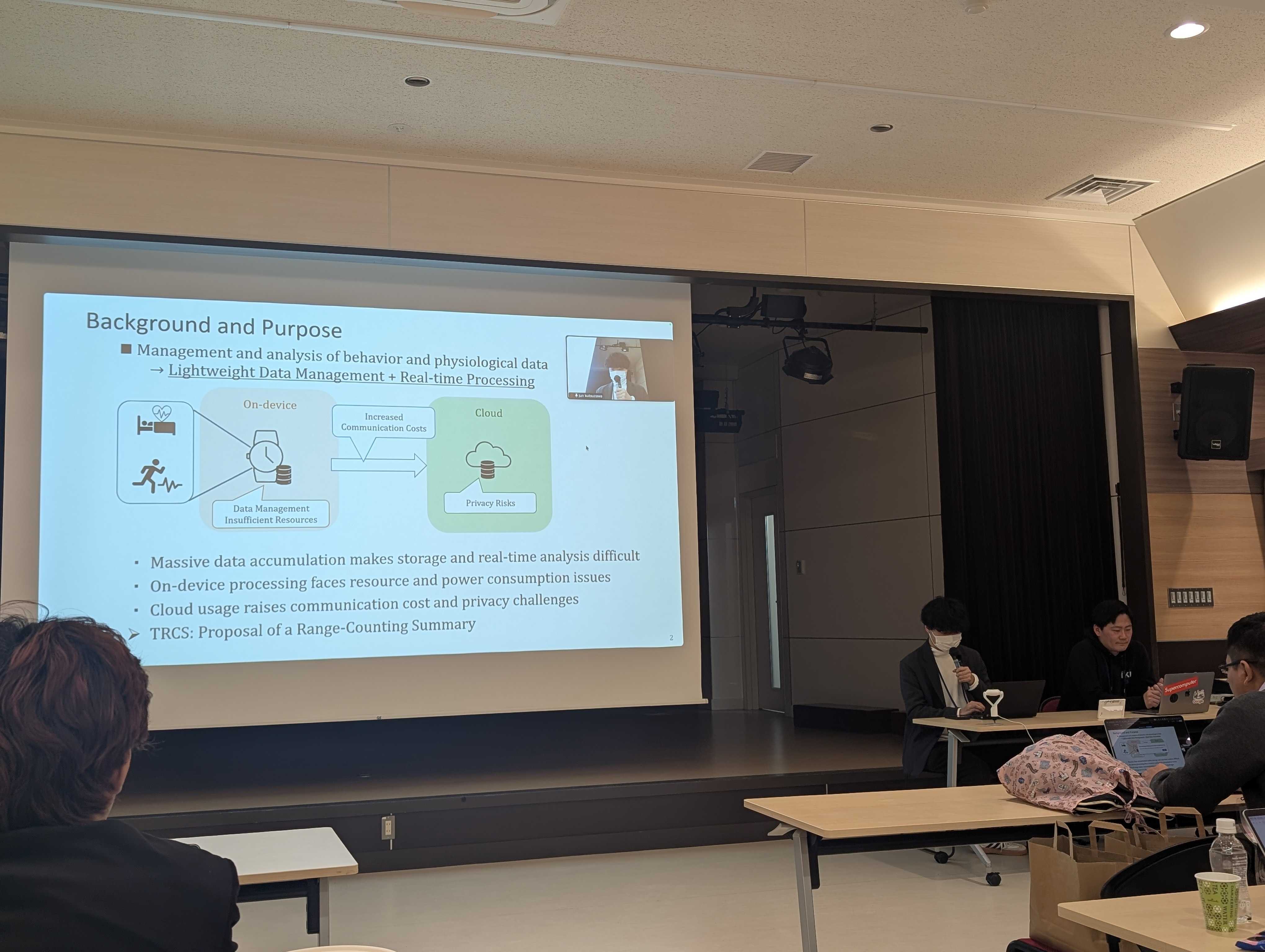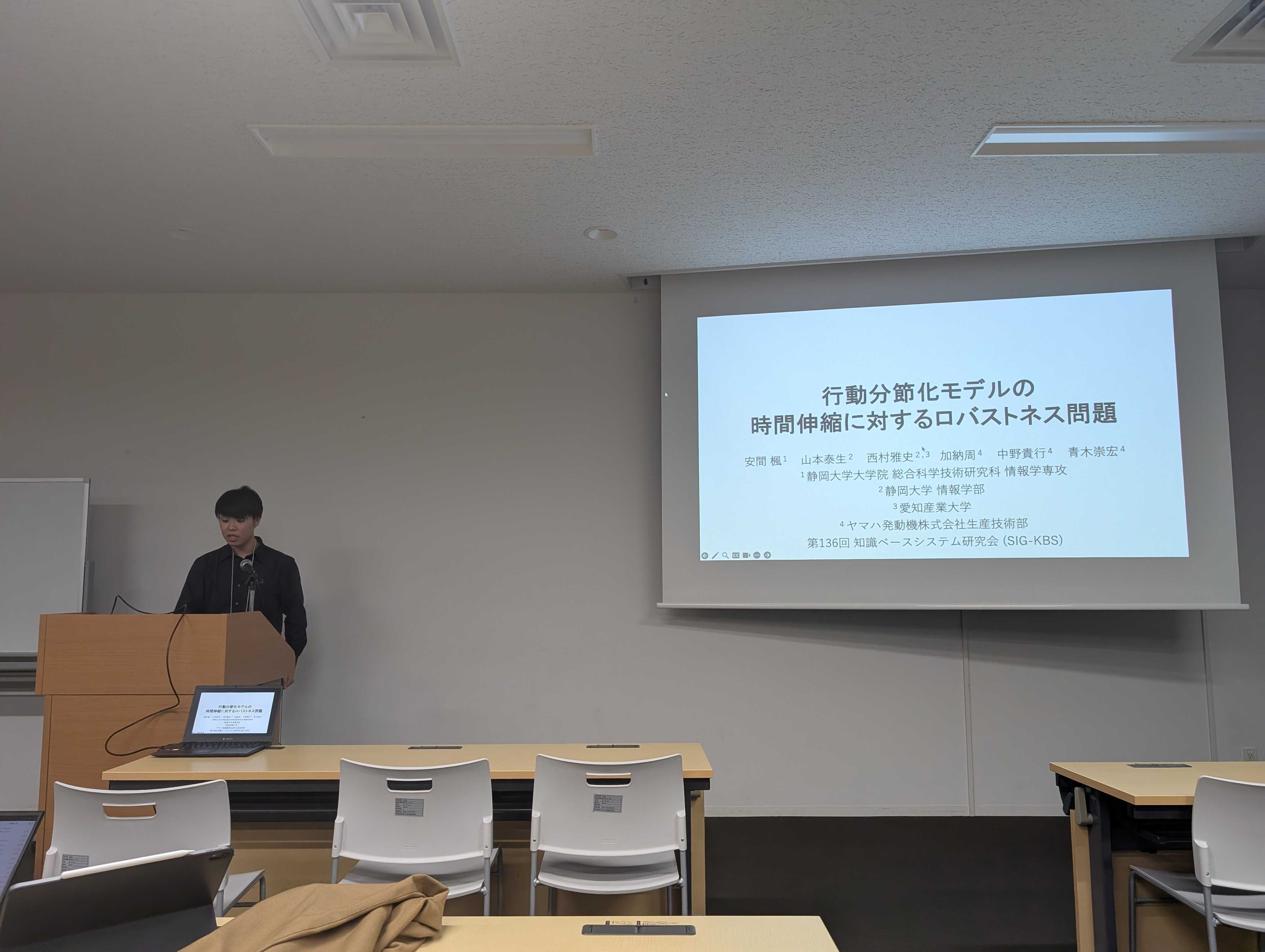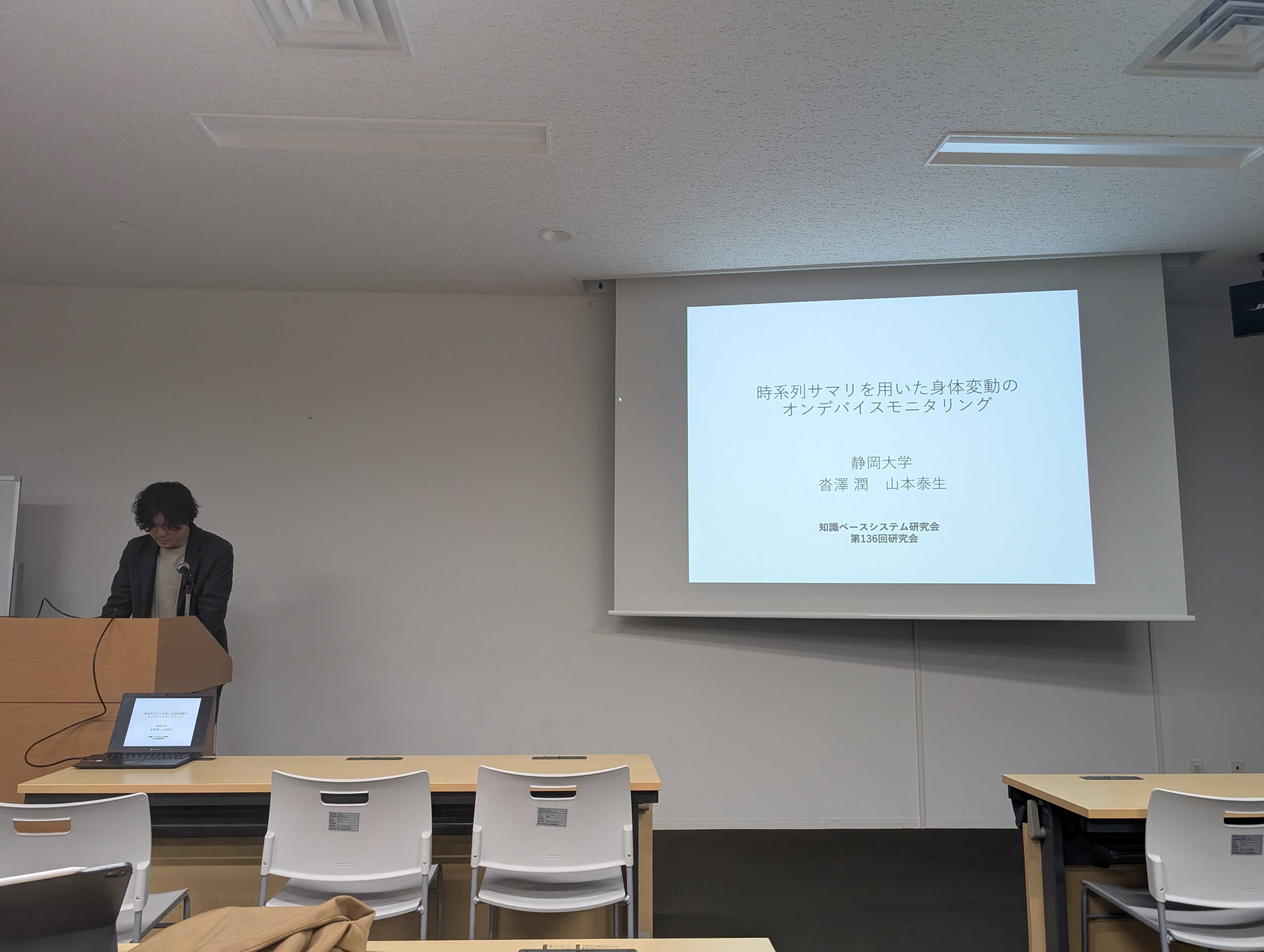 修士学生の沓澤潤さんと安間楓さんの2名が人工知能学会合同研究会 (知識ベースシステム研究会) にて発表を行いました。 沓澤さんの発表は多次元データの範囲計数サマリTRCS (線形符号化) の提案とスマートデバイス上での応用可能性を示す内容でした。 安間さんの発表は時系列行動分節モデルの時間伸縮性に対するロバストネス問題を検証する内容でした。今回のKBSは発表件数が多く、限られた時間での発表&質疑となりました。
