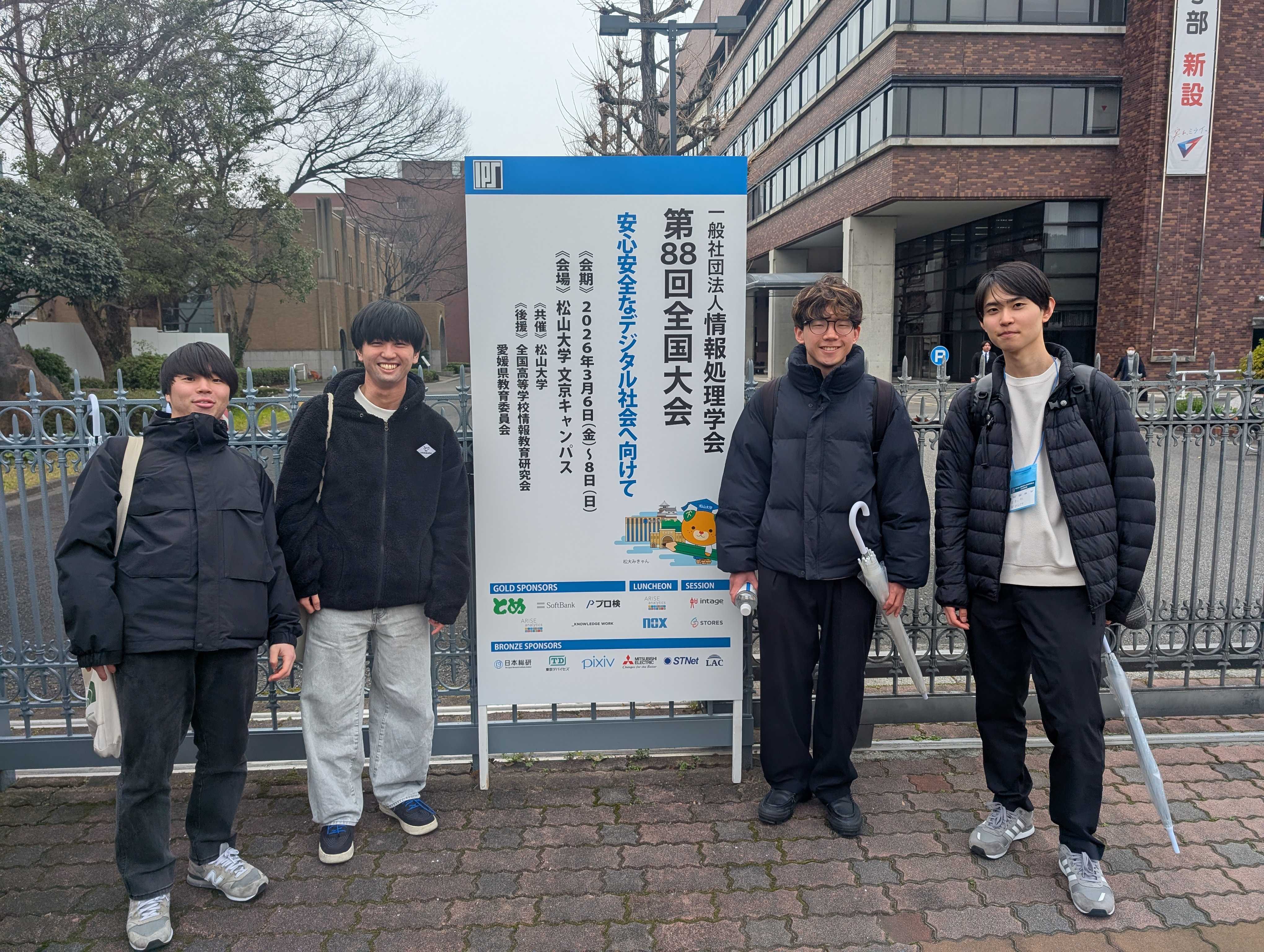 学部4年生の桑山隼矢さん、岸上湧哉さん、長井智哉さん、中込雄己さんの4名が情報処理学会全国大会にて発表を行いました。